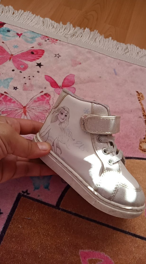 Parlak beyaz renkte, kauçuk tabanlı ve baskılı desenli kız çocuk spor ayakkabısı. Kolay kullanım için cırt cırtlı bantlıdır.