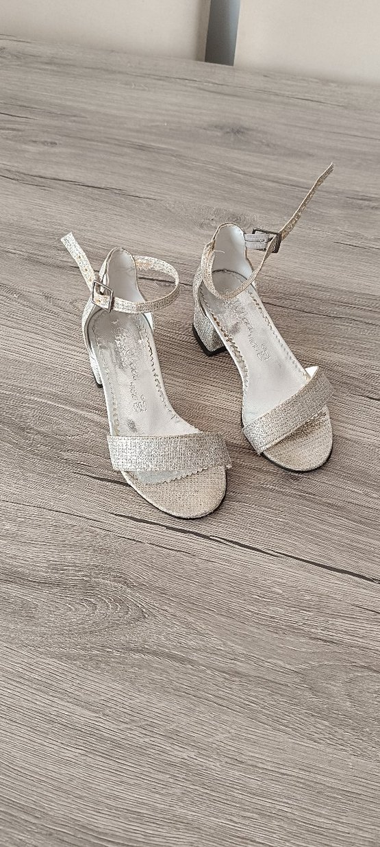 Kız çocukları için özel gün ayakkabısı, parlak beyaz yılan desenli, çağdaş tarzda. Metal topuklu ve tokalı bilek kayışı bulunur.