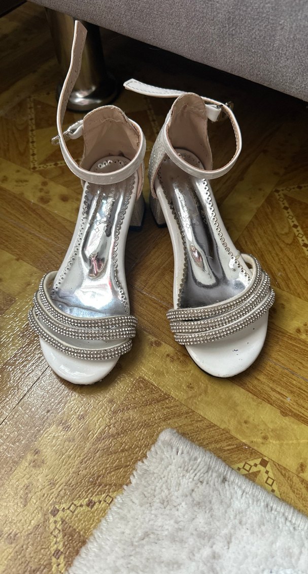 Kız çocukları için payetli bantlara ve parlak görünüme sahip beyaz özel ayakkabılar. Modern tarzda, bilekten bantlı ve alçak topuklu.