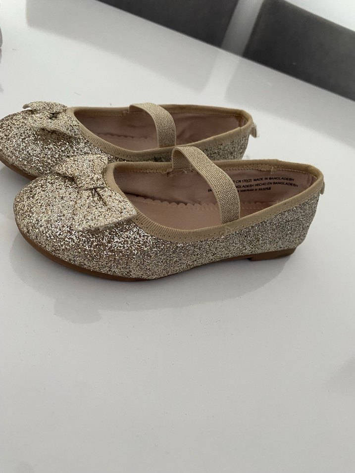 Kız çocukları için parlak gold simli renkte, tokalı bantlı babet ayakkabı.birkaç kez giyildi temiz yakından çektim detaylı.