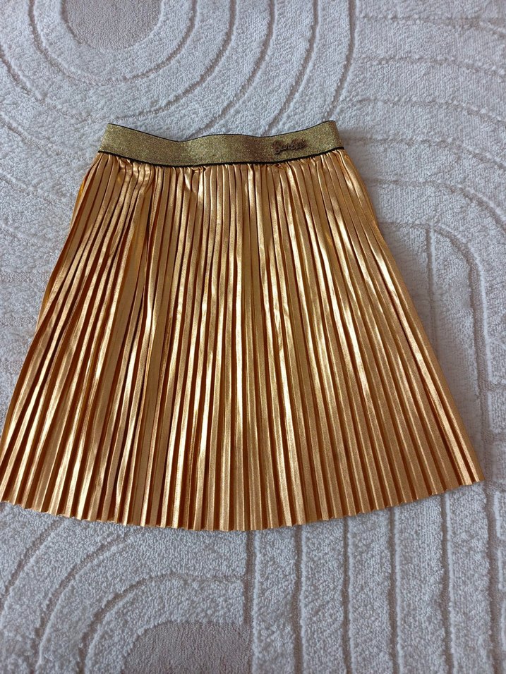 Parlak gold renkli, pileli ve beli lastikli kız çocuk eteği, bohem tarzda şık bir görünüme sahiptir. ✨