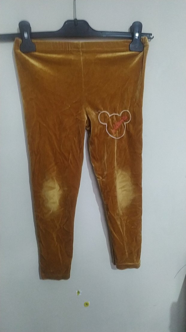 Parlak kahverengi kumaştan yapılmış, düğmeli ve nakış detaylı kız çocuk taytı, şık ve rahat sokak giyimi için uygundur. dizler yipranmis sanılmasın modeli öyle