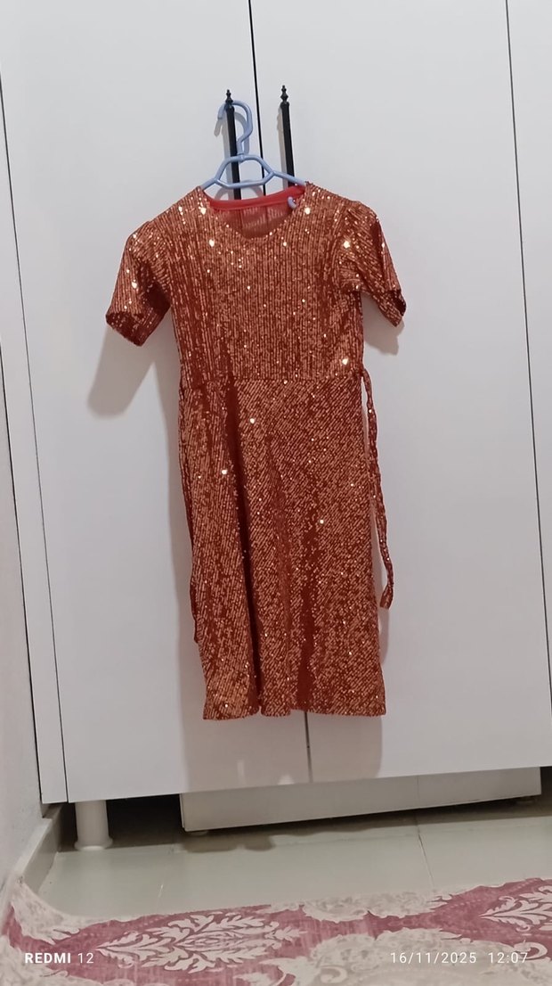 Kısa kollu, V yakalı kız çocuk elbisesi, parlak sentetik kumaştan ve ışıltılı detaylarla tasarlanmıştır. Moda ve sokak stili için uygundur. ✨