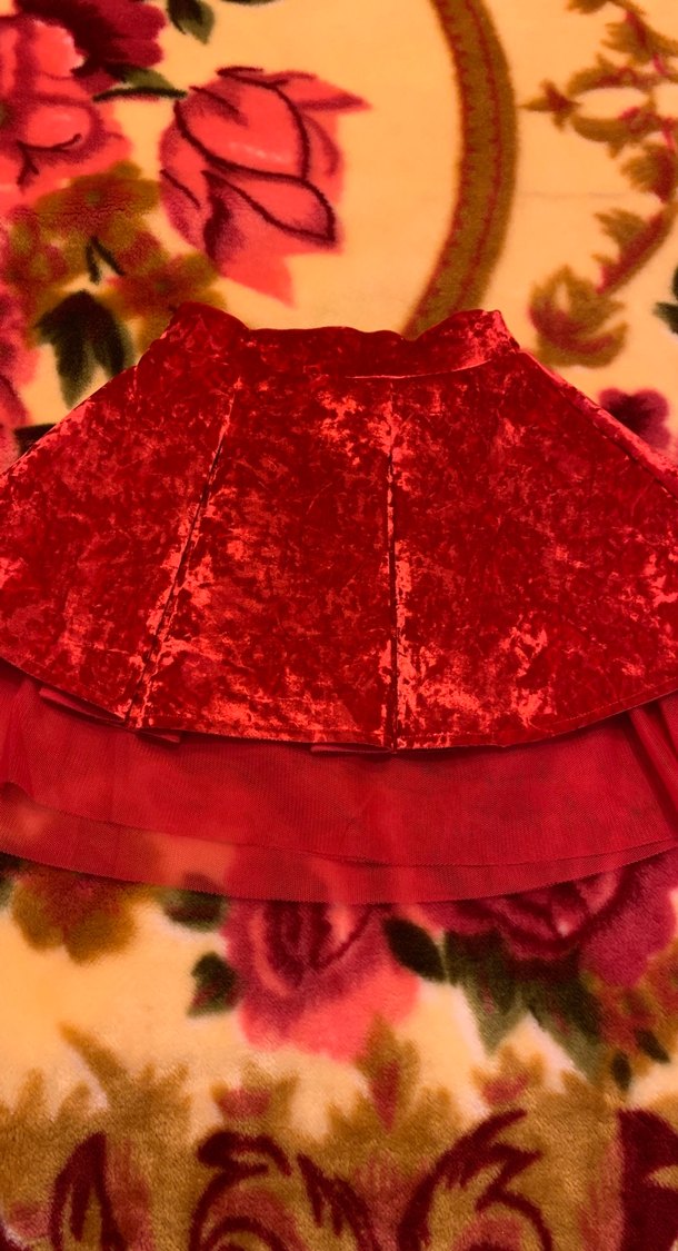 Parlak kırmızı sentetik kumaştan, fırfırlı detaylı, vücuda oturan kız çocuk eteği. Düz ve desensiz, gotik tarzda tasarlanmıştır. ✨
