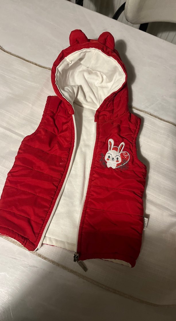 Kız çocukları için kırmızı renkli tavşan desenli fermuarlı kalın şişme yelek. 2-3 kere giydirildi. Deformesi yoktur.