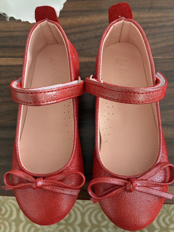Kız çocukları için parlak kırmızı renkte, tokalı bantlı ve pürüzsüz kauçuk malzemeden yapılmış klasik ve modern tarzda babetler. Hiç kullanılmamıştır