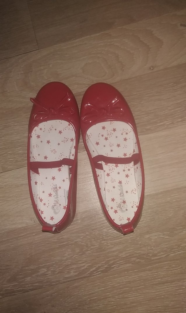 Kız çocukları için parlak kırmızı renkte, tokalı bantlı babet ayakkabılar. Kauçuk malzemeden üretilmiş, iç tabanı yıldız desenlidir.