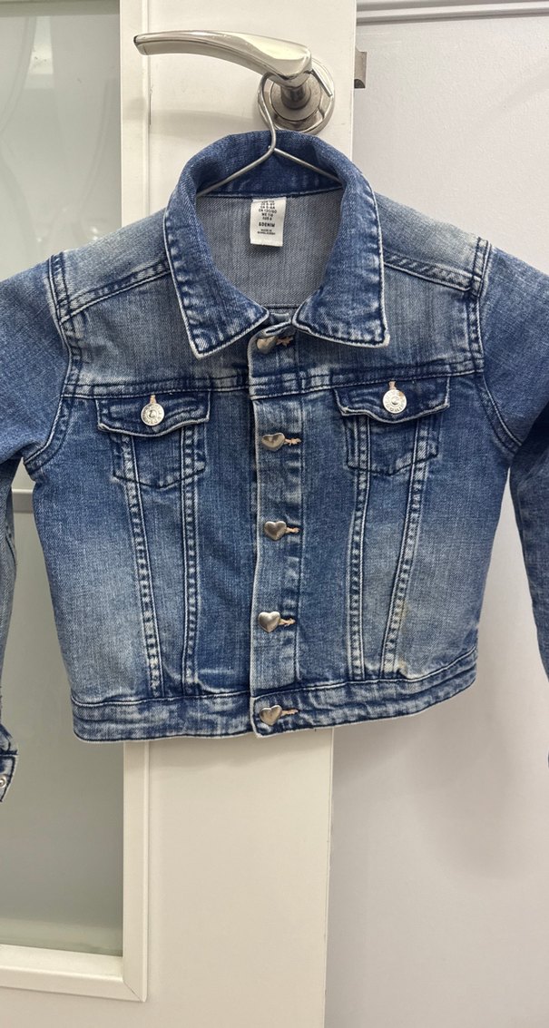 Kız çocukları için düğmeli, yakalı ve parlak mavi batik desenli dar kesim denim ceket. Streetwear tarzına uygun.