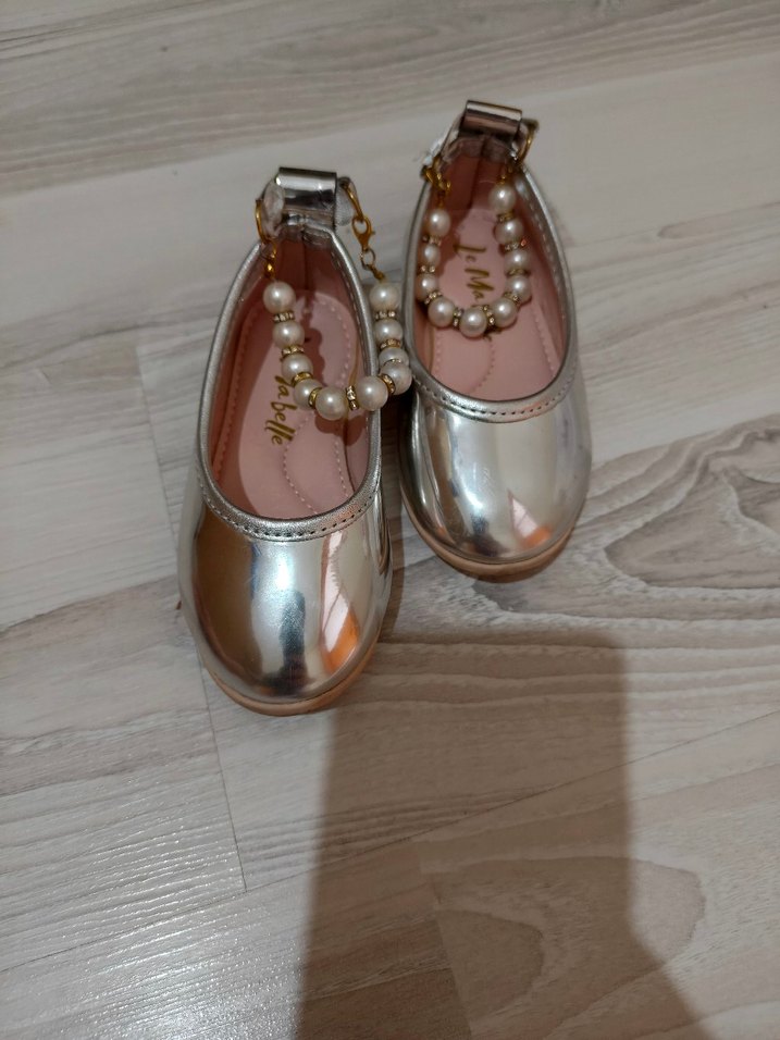 Parlak metalik altın renkli kız çocuk babetleri, tokalı bant ve inci zinciri detaylı, modern klasik tarzda.