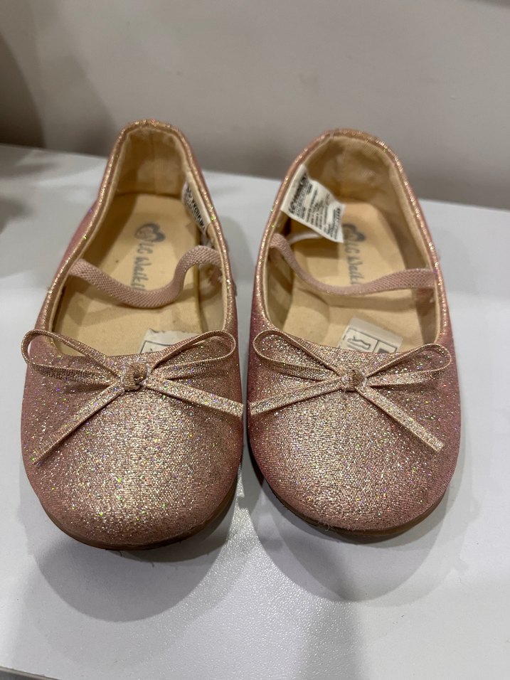 Kız çocukları için parlak pembe renkte, tokalı ve kauçuk malzemeden yapılmış, sade ve bohem tarzda babet ayakkabılar.