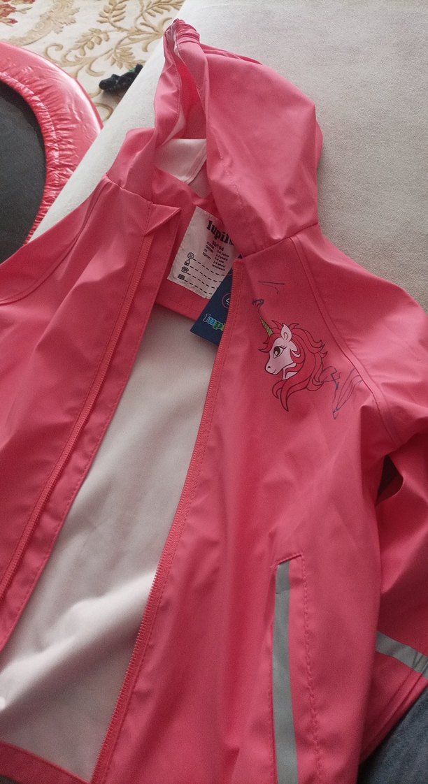 Parlak pembe sentetik kumaştan yapılmış, baskılı unicorn desenli, fermuarlı ve kesimli kız çocuk yağmurluğu. Trend sokak stili için uygundur. ️ Almanya'dan hediye geldi kızın hiç giymedi öyle dolapta duruyor.