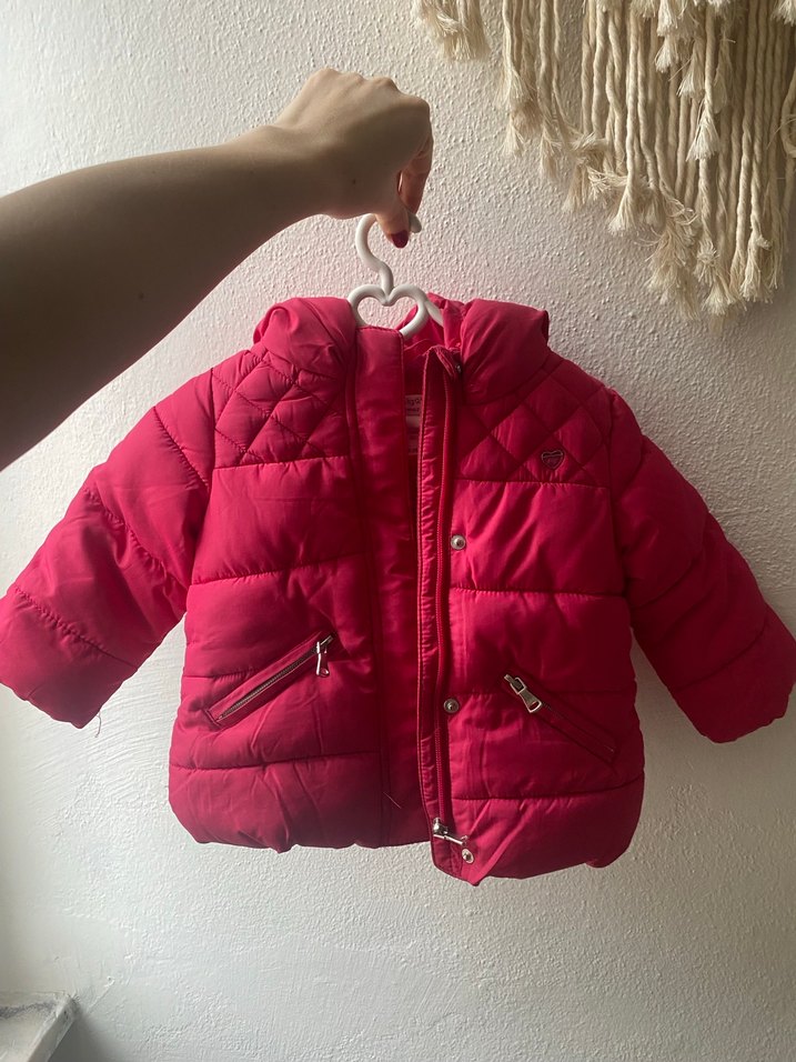 Fermuarlı cepleri, parlak pembe rengi ve kesimli yapısıyla kız çocukları için yumuşak ve sıcak kumaştan mont.