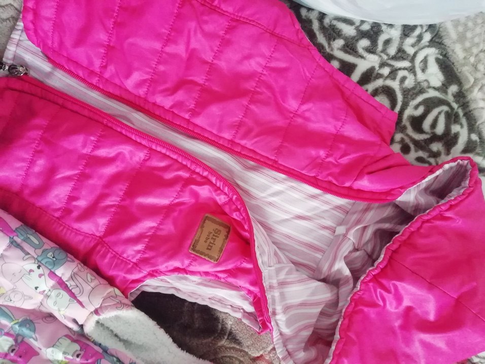 Parlak pembe renkte, fermuarlı ve yakalı kız çocuk yeleği. Sıkı kesim ve askılı kollara sahip, sokak modasına uygun.
