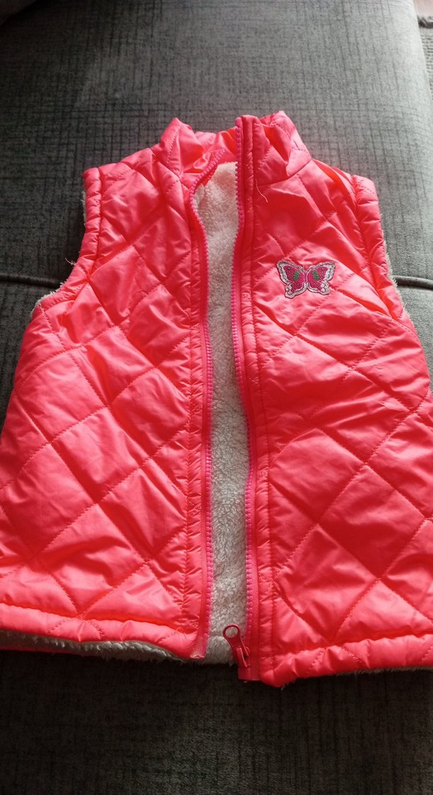 Parlak pembe renkli, fermuarlı ve yakası kesimli kız çocuk yeleği. Kolsuz ve içi yumuşak, sıcak kumaşla kaplıdır. Kelebek detaylıdır.