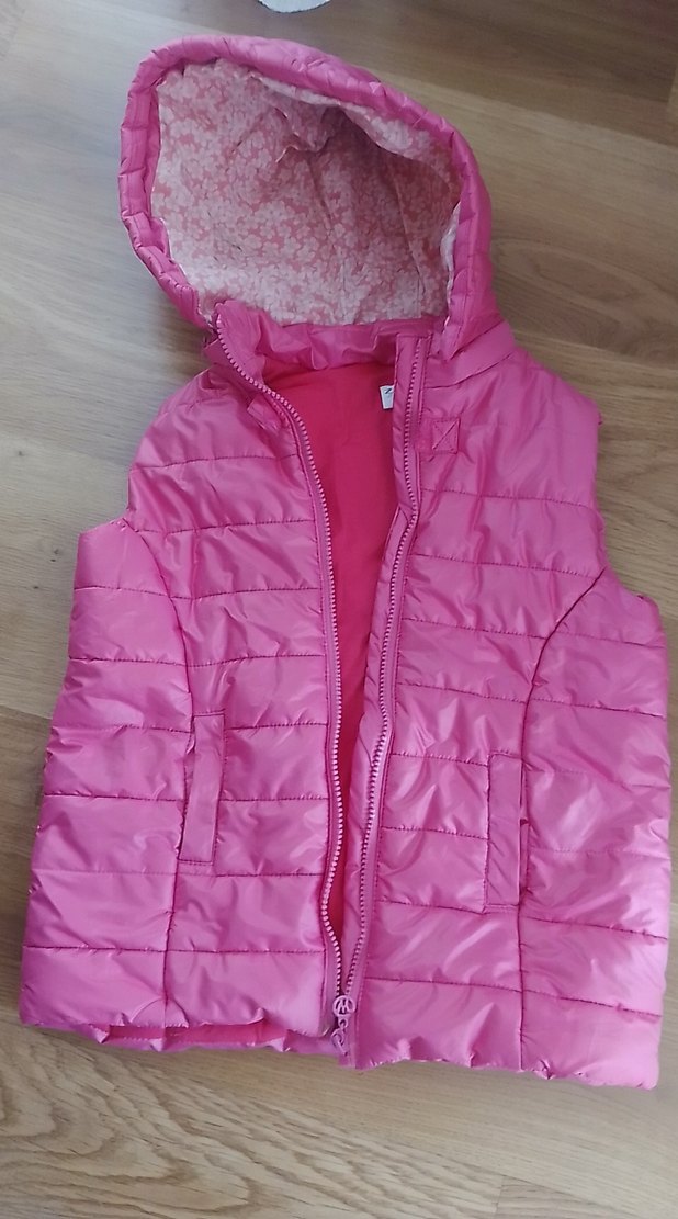 Parlak pembe renkte, kapüşonlu ve fermuarlı kız çocuk yeleği. Kolsuz tasarımı ve yaka detayıyla sokak stiline uygun, dar kesim.