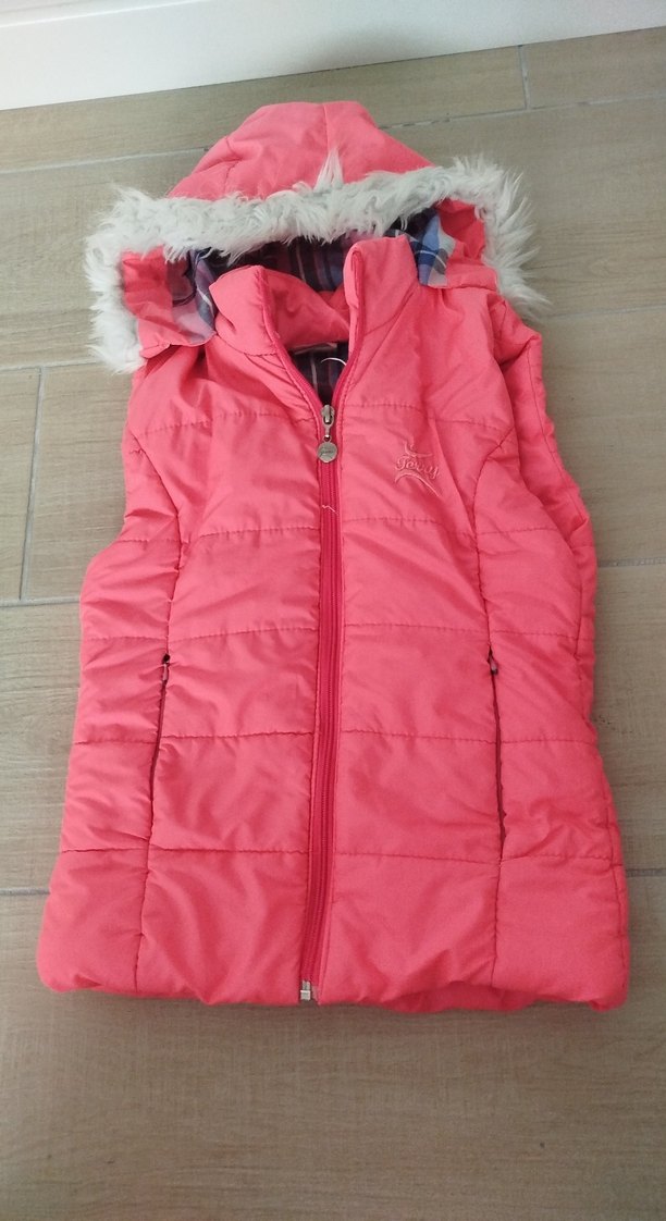 Parlak pembe renkli, kapüşonlu ve kürklü yaka detaylı kız çocuk yeleği. Fermuarlı ve vücuda oturan kesimdedir.