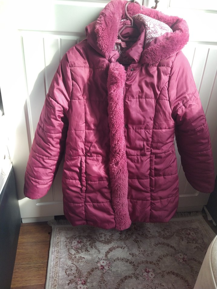 Parlak pembe renkli, kürklü detaylara sahip, fitted kesim kız çocuk ceketi.kemeri yok Notch yakalı ve yumuşak, sıcak kumaştan üretilmiştir.