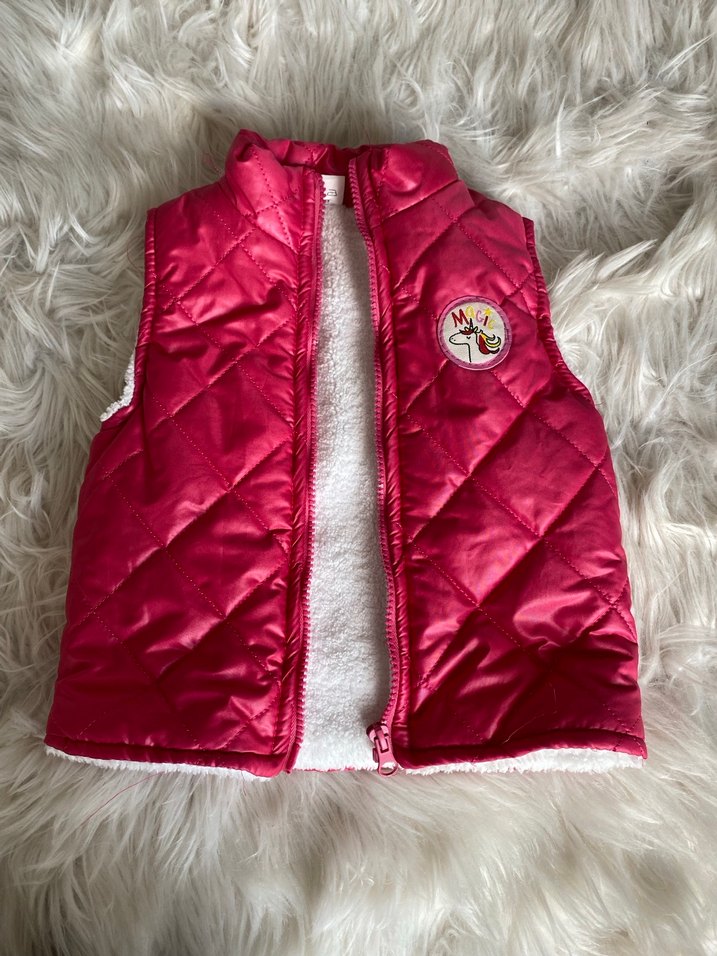 Kız çocuklarına uygun, yakalı ve kolsuz, parlak pembe renkte, işlemeli detaylı, içi yumuşak kürk kaplamalı, dar kesim yelek. ✨