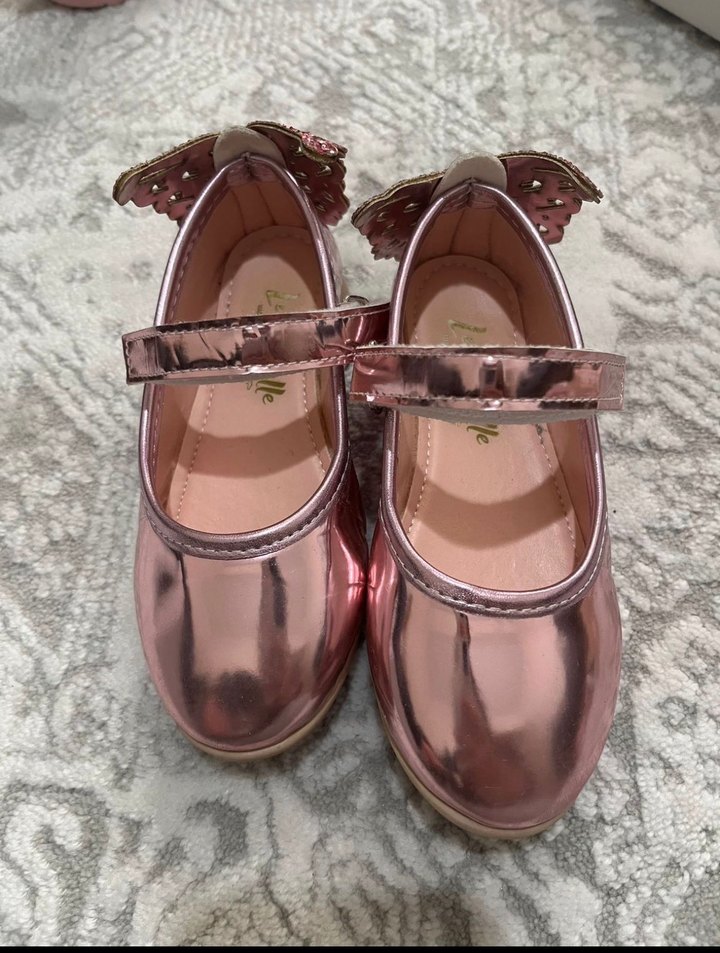 Kız çocukları için parlak pembe renkte, tokalı ve kauçuk malzemeden yapılmış, sokak stili babetler. Desensiz ve hafif retro görünümlü.