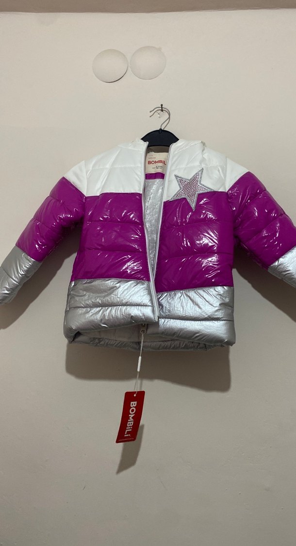 Fermuarlı, kesimli kız çocuk montu; parlak mor, beyaz ve gri renk bloklu, baskılı yıldız detaylı, sokak modasına uygun yumuşak ve sıcak kumaştan. 3 yaş 4 yaş 5 yaş mevcuttur.