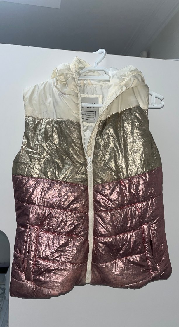 Kolsuz, straplez yaka ve fermuarlı kız çocuk yeleği. Parlak sentetik kumaştan, beyaz, altın ve pembe renklerle modern bir sokak stili sunar. ✨