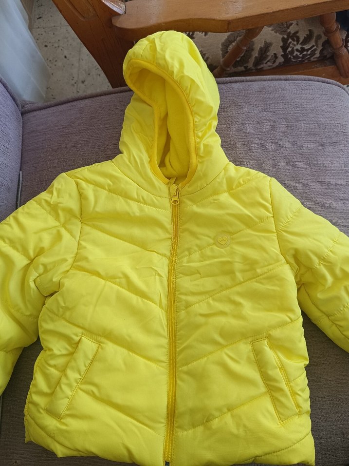 Kız çocukları için parlak sarı renkli, kapüşonlu ve fermuarlı, yumuşak ve sıcak kumaştan yapılmış, sokak modasına uygun dar kesim ceket.