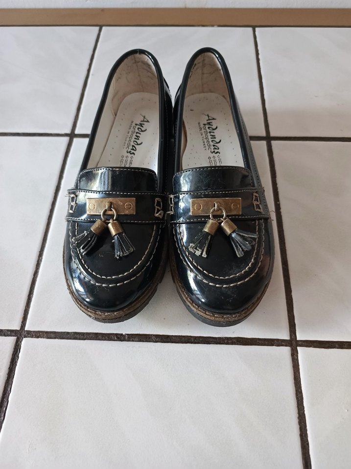 Parlak siyah renkte, tokalı ve baskılı detaylara sahip kız çocuk loafer ayakkabılar. Kauçuk malzemeden yapılmış, klasik tasarımlıdır.