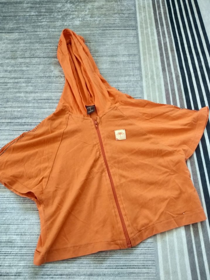 Kız çocukları için kapüşonlu, önden fermuarlı, kısa kollu ve bol kesim parlak turuncu panço. Yumuşak ve sıcak kumaştan üretilmiştir.