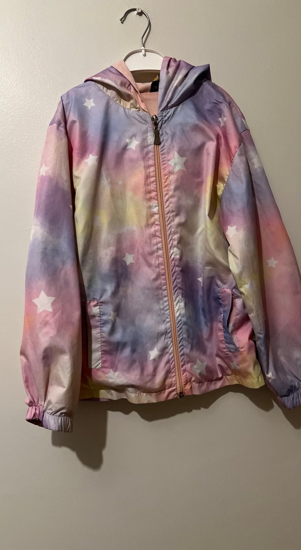 Bol kesim kız çocuk yağmurluğu, pastel batik desenli ve yıldız baskılı. Çentikli yaka, fermuarlı kapanış ve yan cepler bulunur, gündelik sokak stili için uygun.