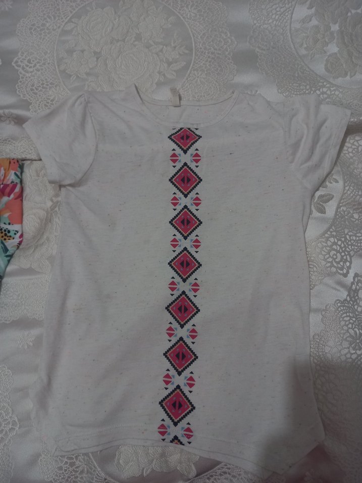Beyaz renkli, kısa kollu ve yuvarlak yakalı kız çocuk tişörtü. Boncuk detaylı baskılı deseniyle bohem tarzı yansıtıyor.