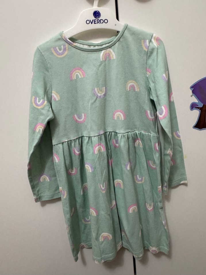 Pastel çok renkli bu elbise, uzun kollu, bol kesim ve fırfır detaylara sahiptir. Yumuşak fleece kumaştan, yuvarlak yakalı ve gökkuşağı desenlidir. 2/4 yaş