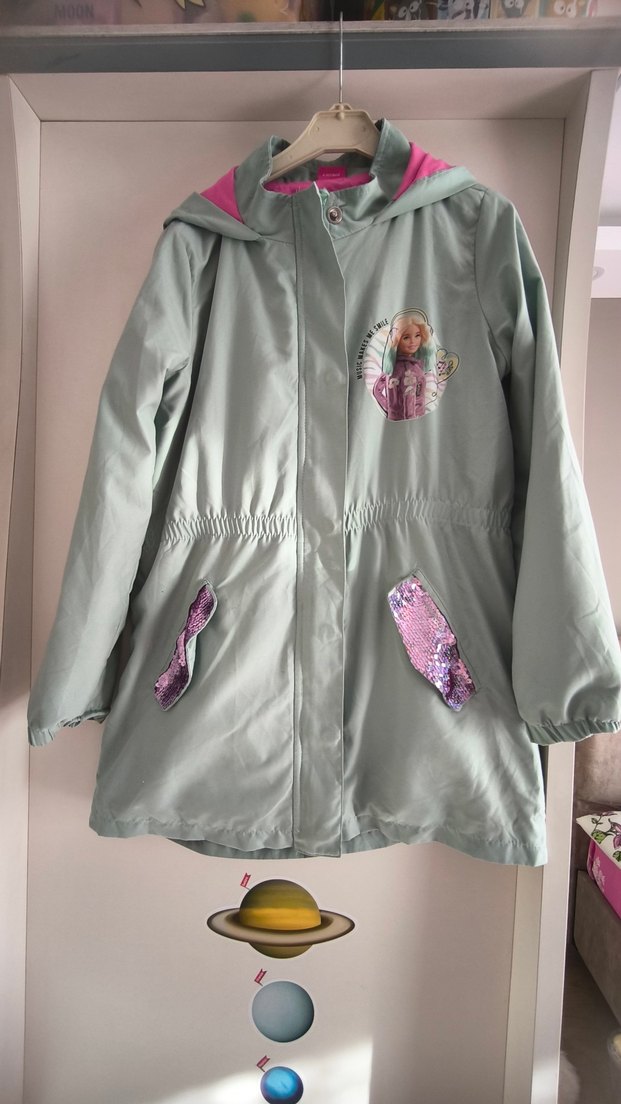 Kız çocukları için pastel gri renkte, düğmeli ve notalı yaka detaylı bol kesim mont. Baskılı ve parlak mor ceplerle sokak stili sunar.