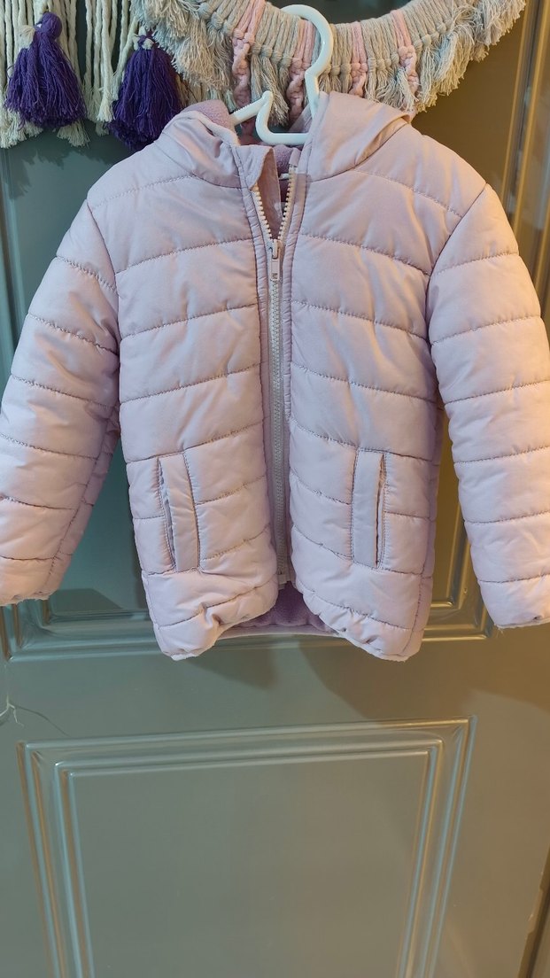 Kız çocuklar için pastel lila renkte, içi polar yumuşak ve sıcak kumaştan yapılmış, fermuarlı ve cepli mont.