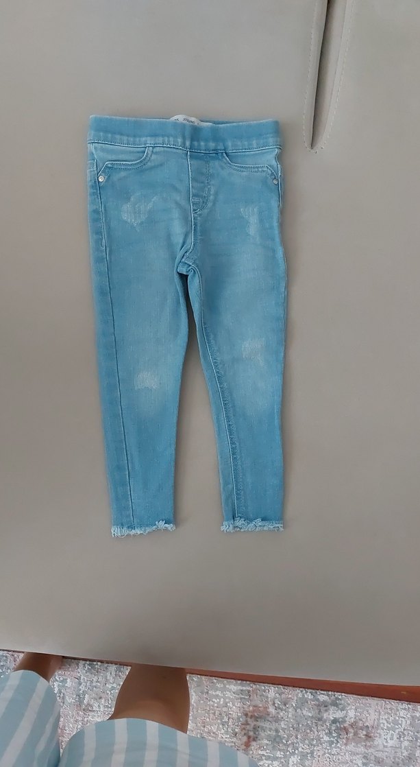 Pastel mavi tonlarında, elastik bel bantlı ve hafif batik desenli, dar kesim kız çocuk denim pantolon. Sokak modasına uygun, uçları hafif yıpranmış detaylı.