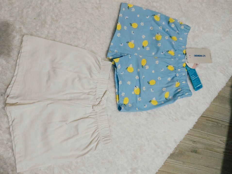Pastel mavi üzerine limon ve çiçek desenli şort ile beyaz düz şort, elastik bel bantlı rahat iki parçalı set.