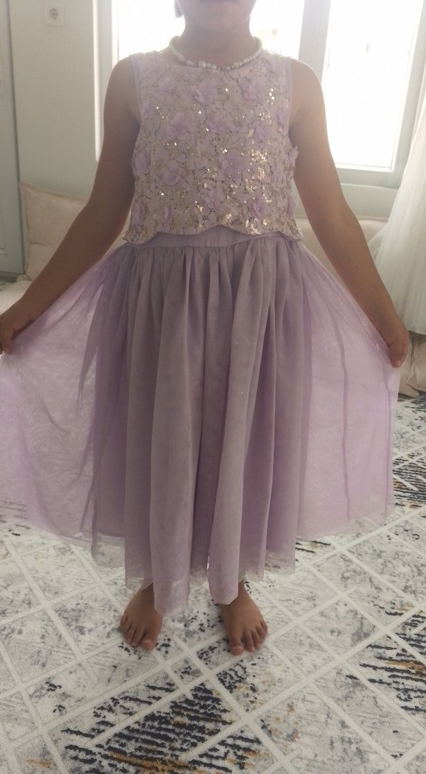 Pastel mor tonlarında, dantel işlemeli straplez ve vücuda oturan kız çocuk elbisesi, yumuşak sentetik kumaştan hafif ve dökümlü etek ile.