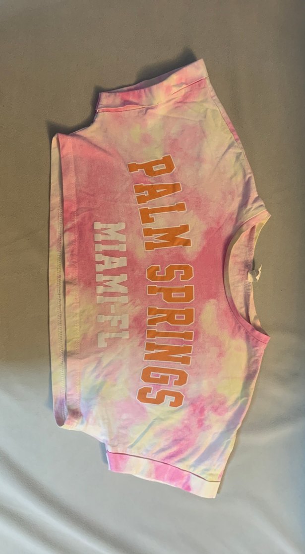 Bol kesim, pastel pembe batik desenli kız çocuk tişörtü. Yumuşak sentetik kumaştan, kısa kollu ve straplez yakalı, bohem sokak stili. "PALM SPRINGS, MIAMI-FLY" baskılı.
