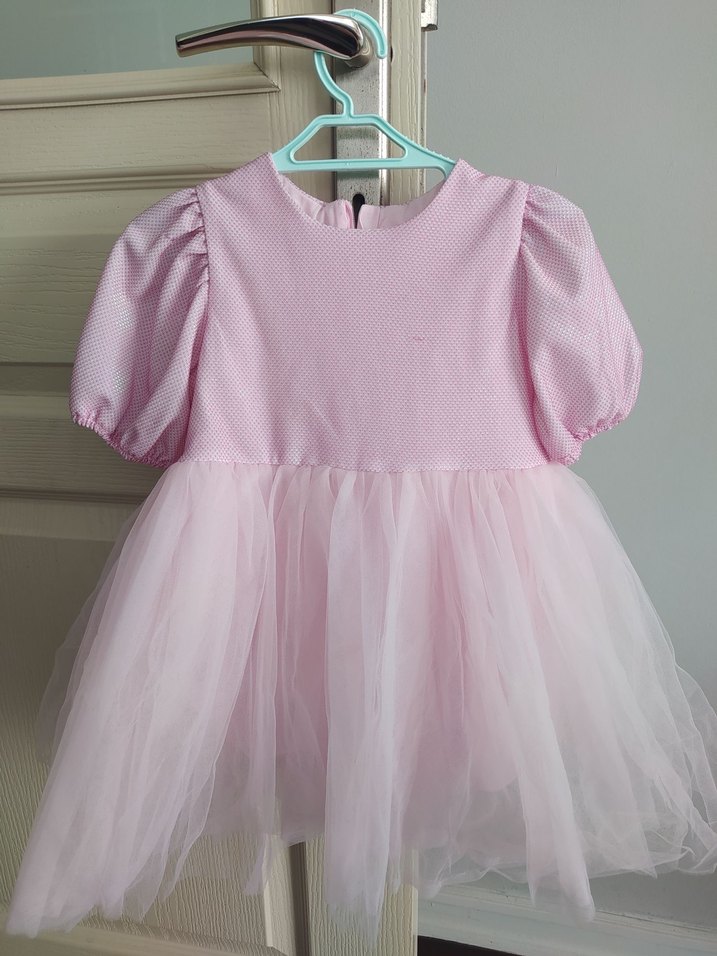 Kısa kabarık kollu ve yuvarlak yakalı, yumuşak sentetik kumaştan yapılmış, pastel pembe üst kısmı dokulu, altı katmanlı tül kabarık etekli, trend bir kız çocuk elbisesi.