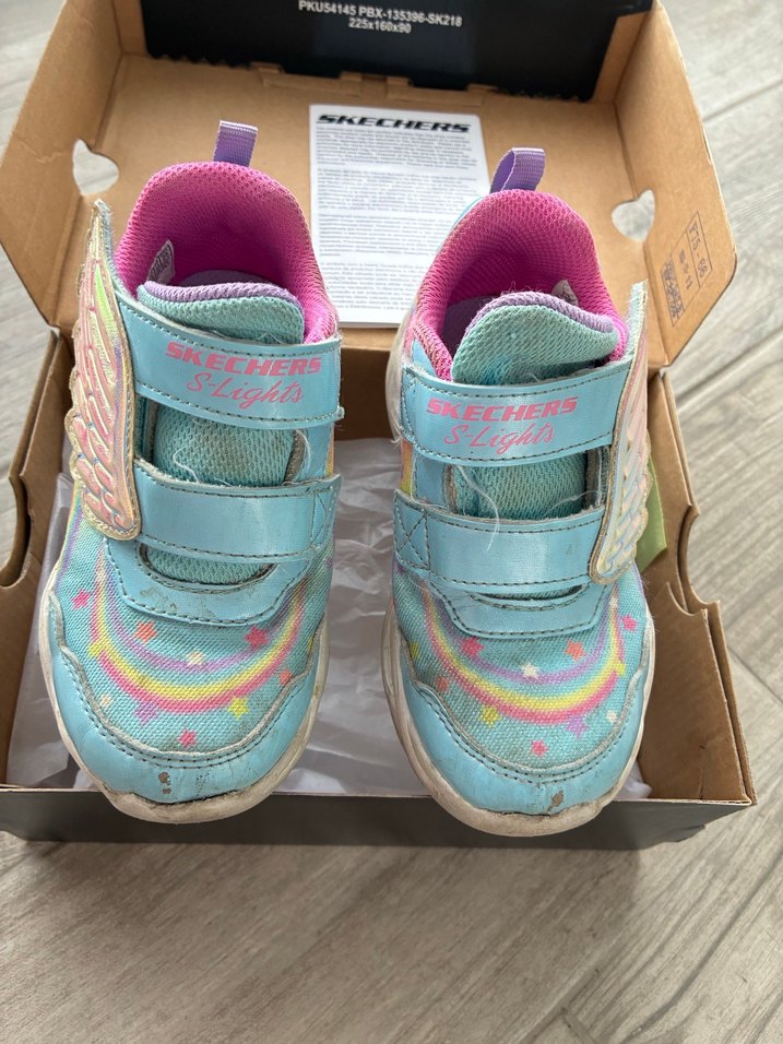 Skechers markalı, pastel renkli, bağcıksız cırt cırtlı kız çocuk spor ayakkabısı. Üründe kullanıma bağlı oldukça yıpranma mevcuttur. Fotoğraflarda belirtilmiştir. İhtiyacı olana uygun fiyata vereceğim. Işıkları yanmaktadır.
