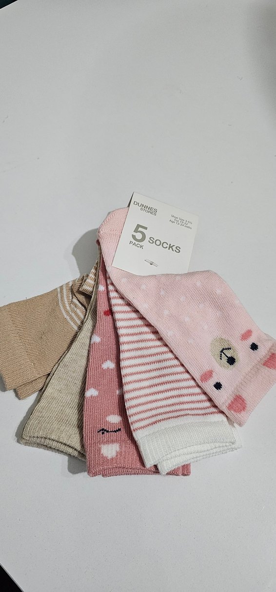 Yumuşak ve sıcak kumaştan yapılmış, pembe tonlarda ve desenli kız çocuk çoraplarından oluşan 5'li pastel renkli set.
