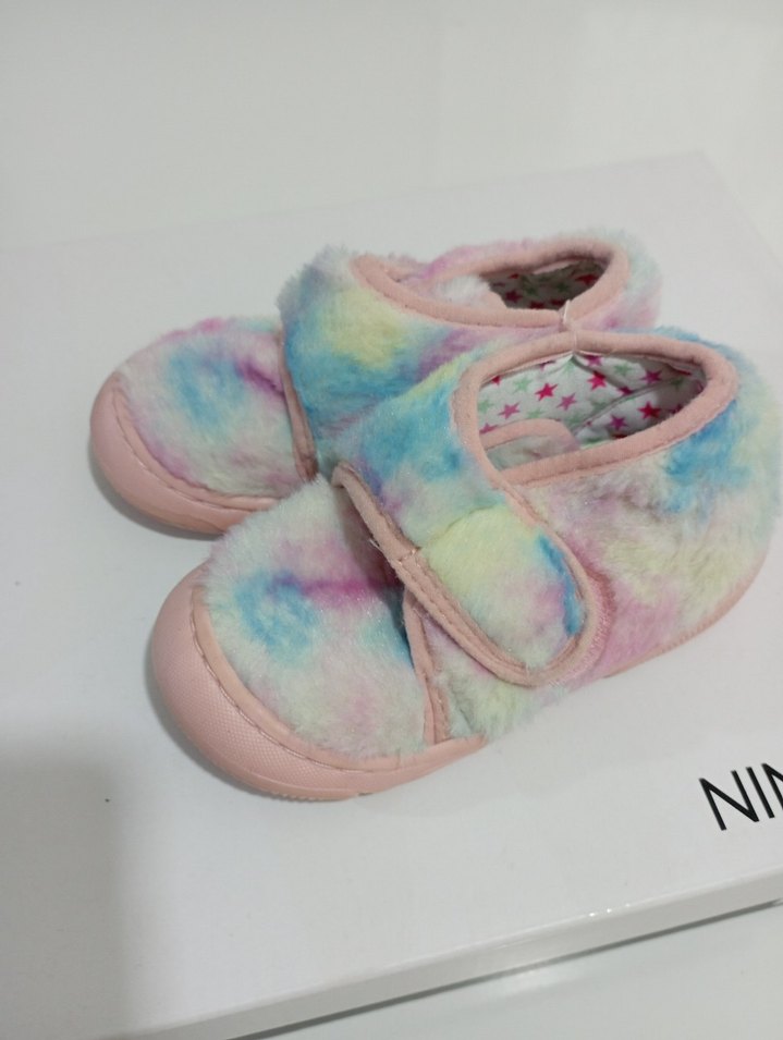 Kız çocukları için pastel renkli tie-dye desenli, yumuşak kürk detaylı sıcak terlikler.
