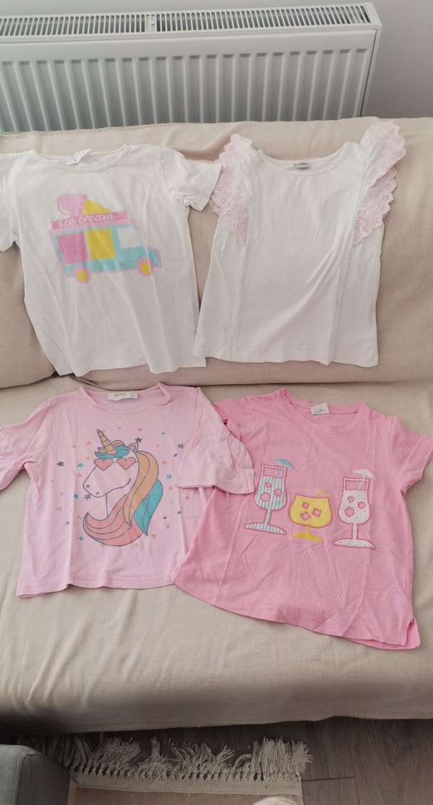 Pamuklu, kısa kollu, bisiklet yaka, bol kesim kız çocuk tişörtleri. Pastel pembe ve beyaz renklerde, baskılı desenlerle süslenmiştir. Lekeler var ikisinde, fotoğraf ekledim. Pembe unikorn desenli olanın baskısı hafif silik.