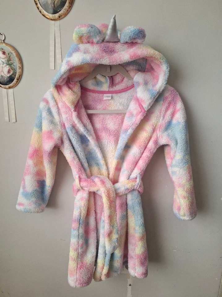 Kız çocukları için yumuşak ve sıcak kumaştan, pastel renkli batik desenli bornoz. Kapüşonunda unicorn kulakları ve boynuzu, belinde bağlama kemeri bulunur.