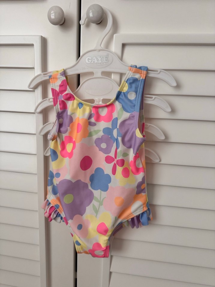 Kolsuz, pastel renklerde çiçek desenli kız çocuk mayosu. Plaj için uygun, yumuşak ve renkli tasarımı rahatlık sağlar.