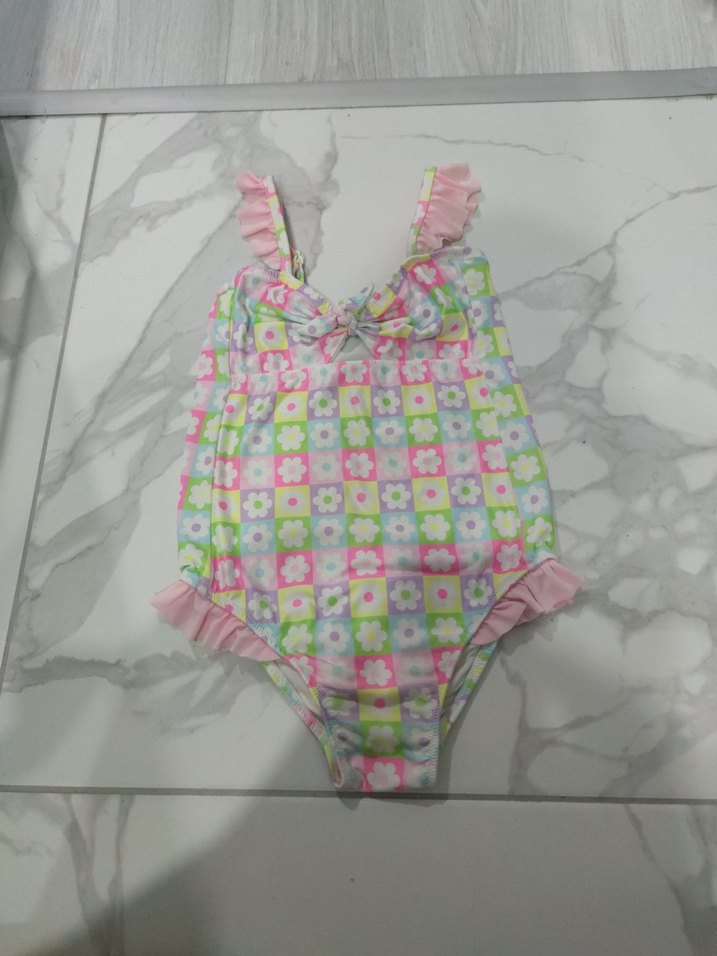 Kız çocuk mayo, pastel çok renkli çiçek desenleri, askılı ve fırfırlı detaylara sahiptir, plaj için uygundur.