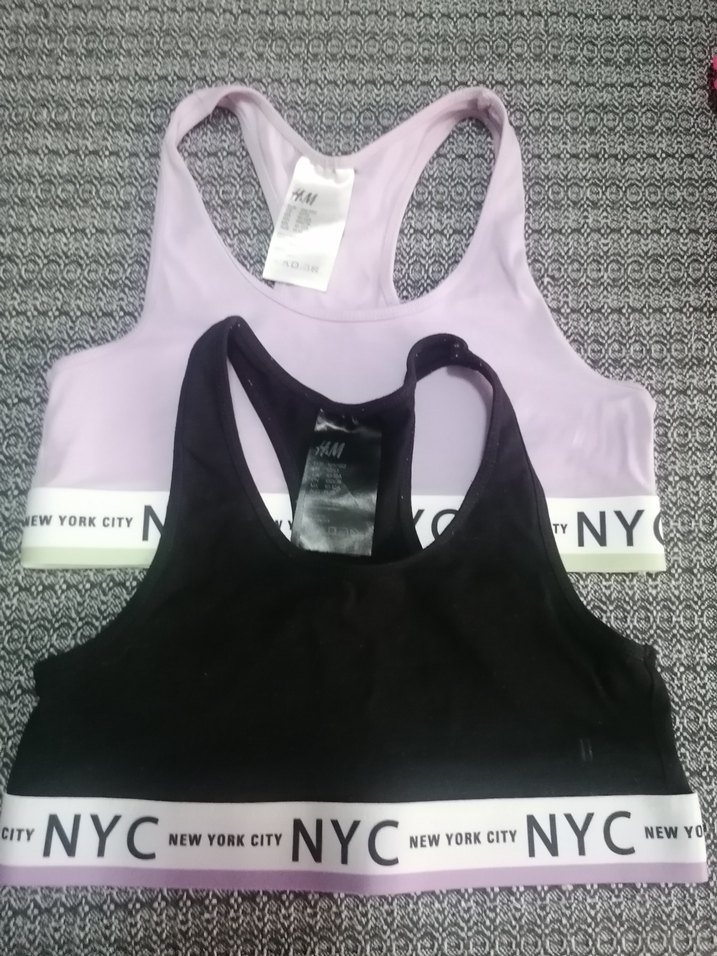 Pastel mor ve siyah renklerde, NYC New York City baskılı bantlı mini spor sütyenleri. Kısa boy ve sokak modası tarzında. ️11-12 yaş