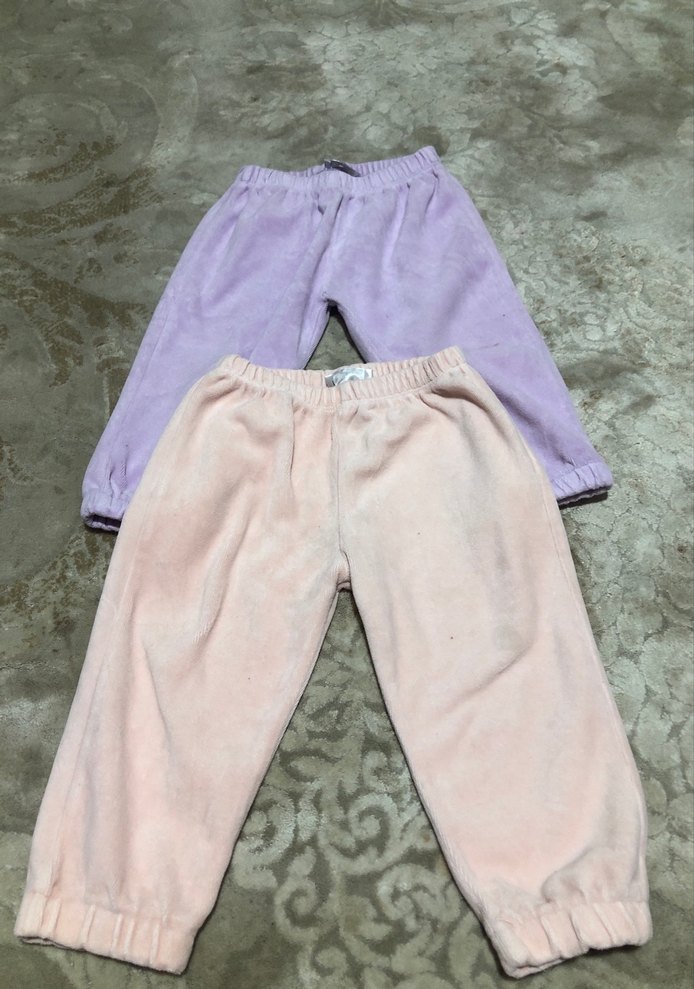 Yumuşak ve sıcak kumaştan, pastel pembe ve mor renklerde, bol kesim kız çocuk pantolonları. Desensiz, rahat ve temel bir stile sahip.
