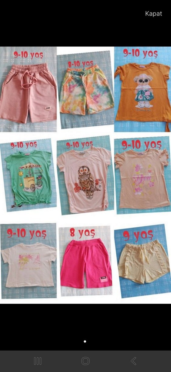 9 parça . Tişörtlesifir. . Pamuklu, rahat kesim kız çocuk tişörtü, kısa kollu ve straplez yakalı, renkli baskılı desenlerle dikkat çekiyor.