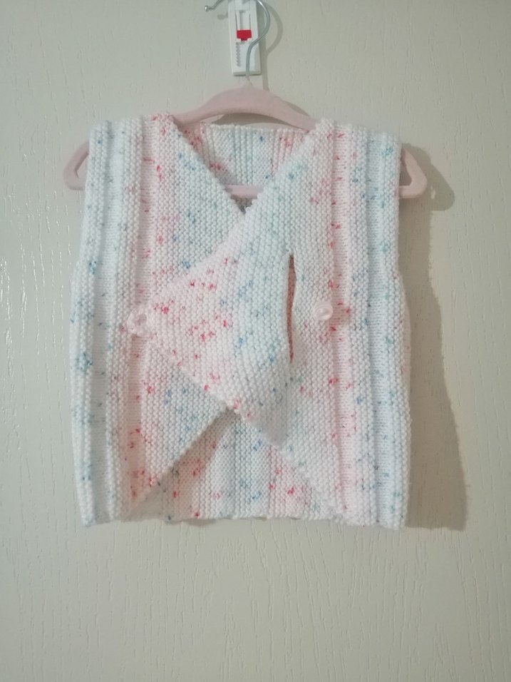 Kız çocuklar için pastel tonlarda bağlama desenli, V yaka örme yelek. Örme kumaştan, kolsuz ve bol kesimdir. Hiç giyilmedi sadece yıkandı.