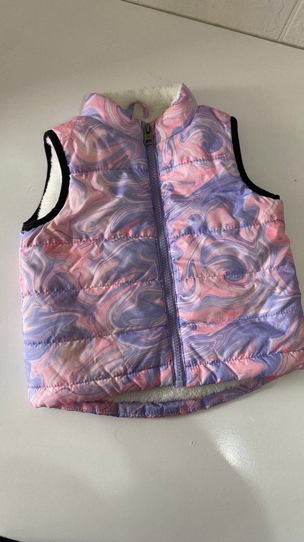 Kız çocuk yeleği, pastel tie-dye desenli, yüksek yakalı ve kolsuzdur. Sıkı kesimi ve iç kısmındaki yumuşak kürk detayı ile rahat ve sıcak tutar.